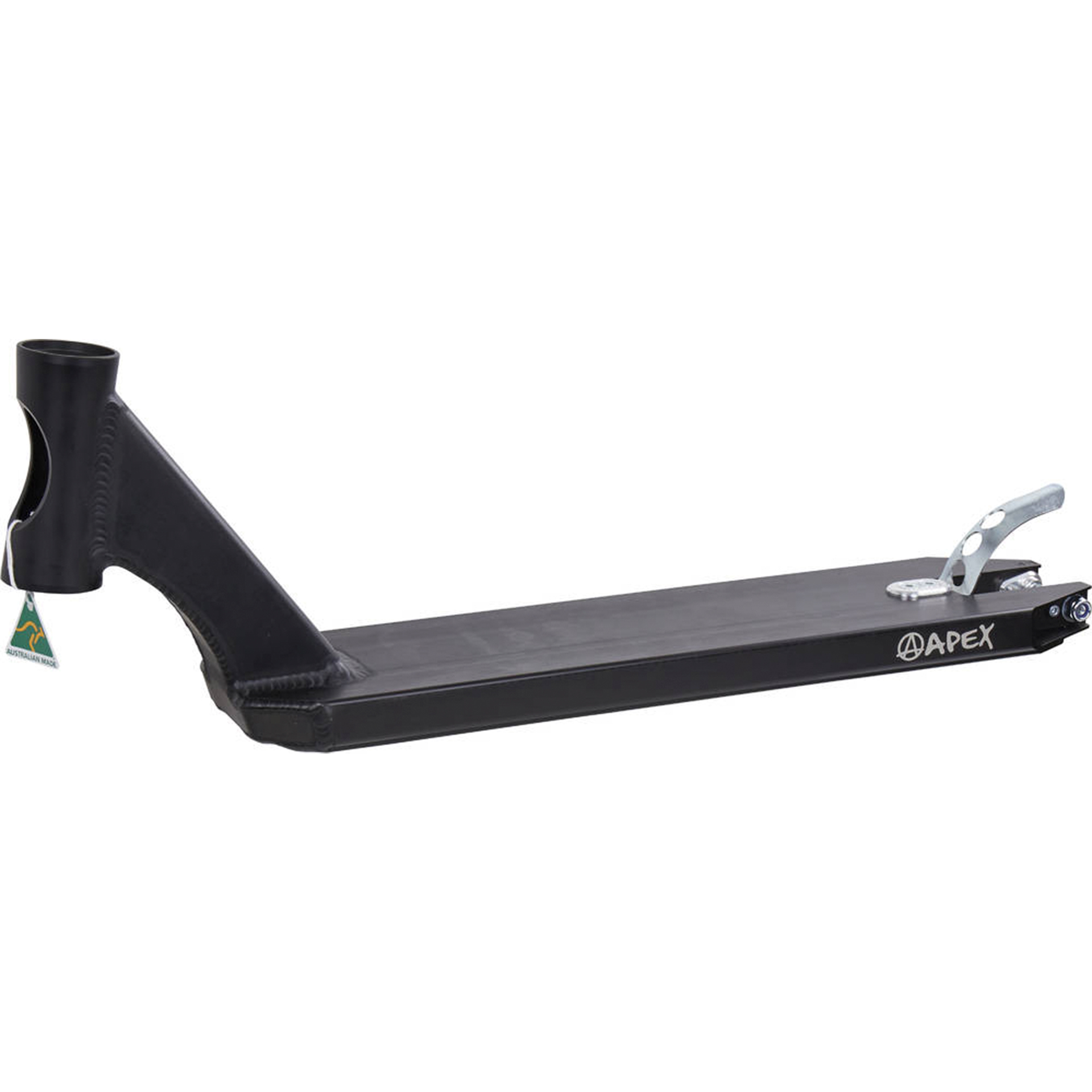 Najwyższej jakości deck od Apex Scooters z Australii. Zrobiony ze specjalistycznego australijskiego aluminium T6/6082, wycinanego metodą CNC, z nadrukiem laserowym. W skrócie – jest to materiał i produkt najwyższej jakości, zrobiony przy pomocy najkłodniejszej techniki i maszyn. Deck idealny do grindowania, posiada wygładzone boki, co chroni Twoje dłonie podczas robienia trików. Ulepszony design headtube daje więcej miejsca na stopy.